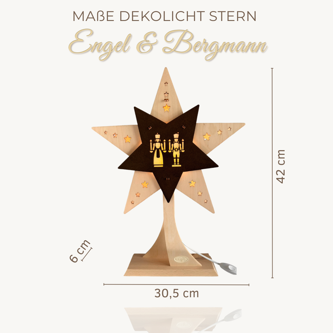 Das Dekolicht LED Stern Engel und Bergmann mit Ständer vereint klassische Holzkunst mit moderner LED-Technologie. Das kunstvoll gestaltete, beidseitige Motiv zeigt einen Engel und einen Bergmann – ein Symbol für Hoffnung, Licht und Tradition. Die warmweiße Beleuchtung sorgt für eine gemütliche Atmosphäre und verwandelt jeden Raum in eine festliche Wohlfühloase. Perfekt geeignet als Weihnachtsdekoration für Wohnzimmer, Fensterbank oder Eingangsbereich.