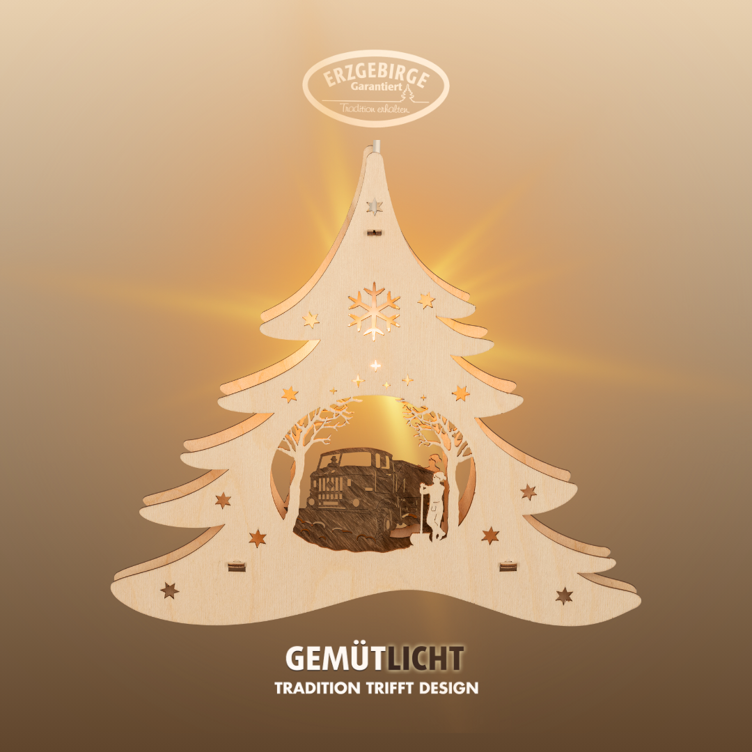 Gefertigt aus feinem Birkensperrholz, besticht dieses Fensterbild durch präzise Laserschnitte und detailreiche Verarbeitung. Die liebevoll gestaltete Szene mit dem W50 verleiht Ihrer Weihnachtsdekoration einen humorvollen und zugleich nostalgischen Charme. Die Tannenbaumform rundet das winterliche Motiv perfekt ab und macht das Fensterbild zu einem echten Hingucker.
