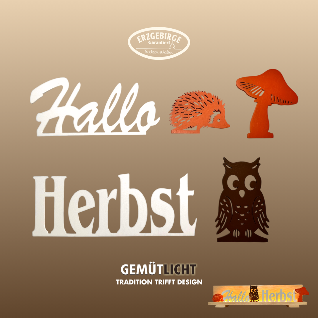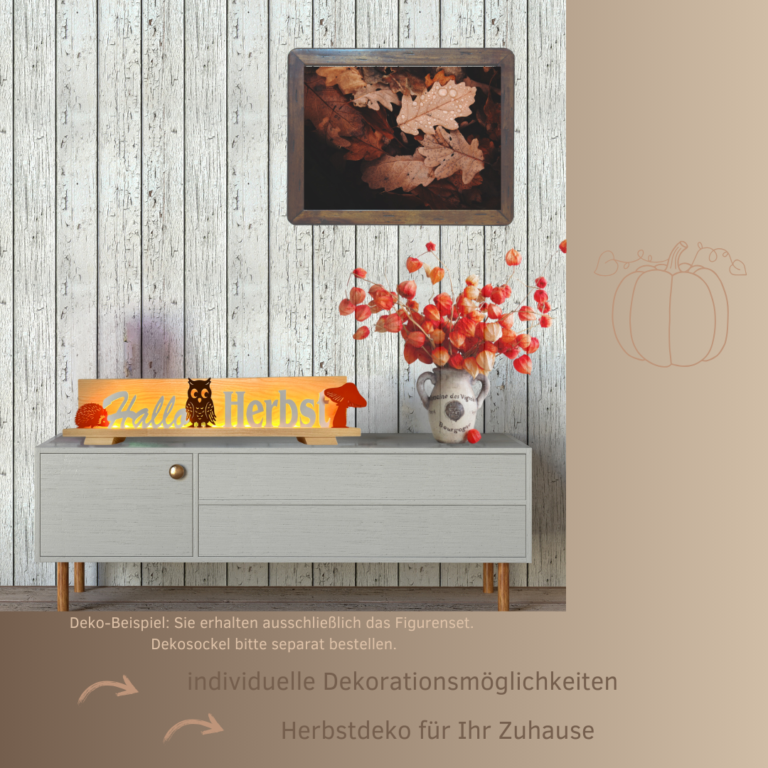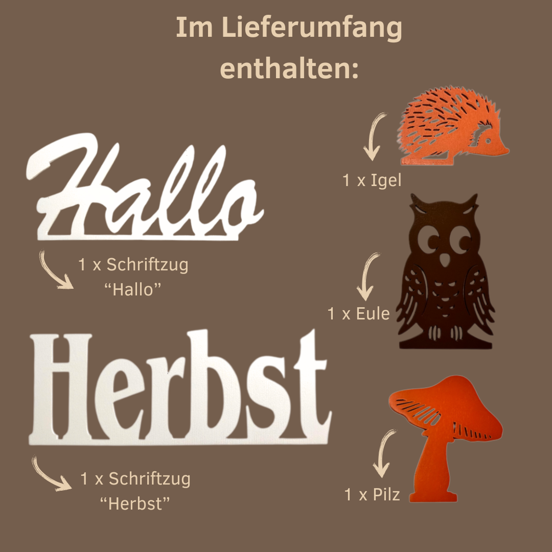- 5-teiliges Figurenset – inklusive Schriftzug „Hallo“, Schriftzug „Herbst“, Igel, Eule und Pilz
