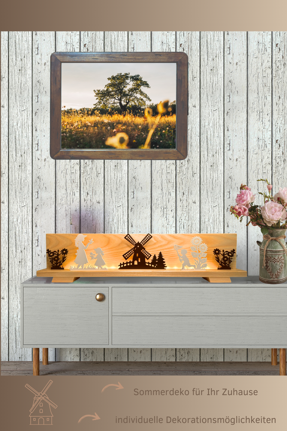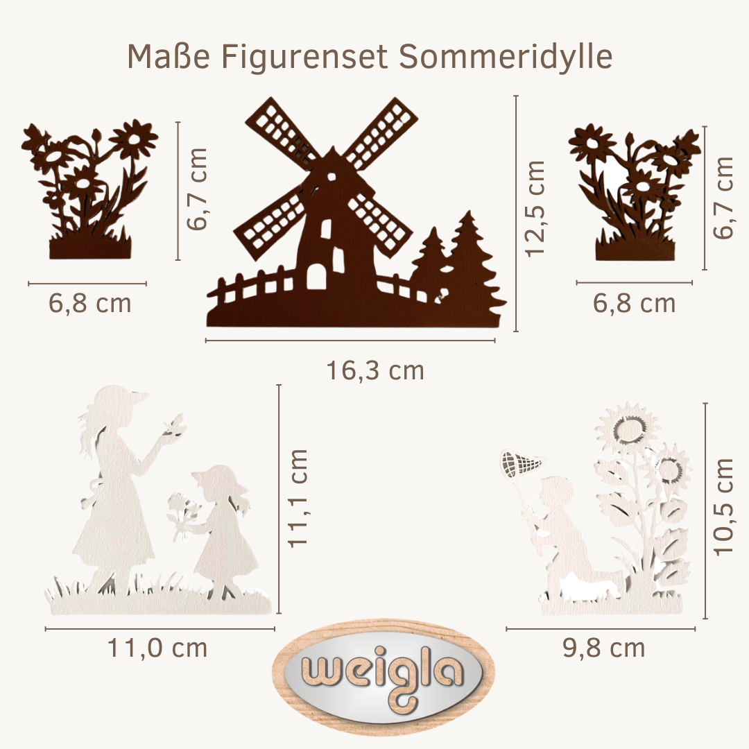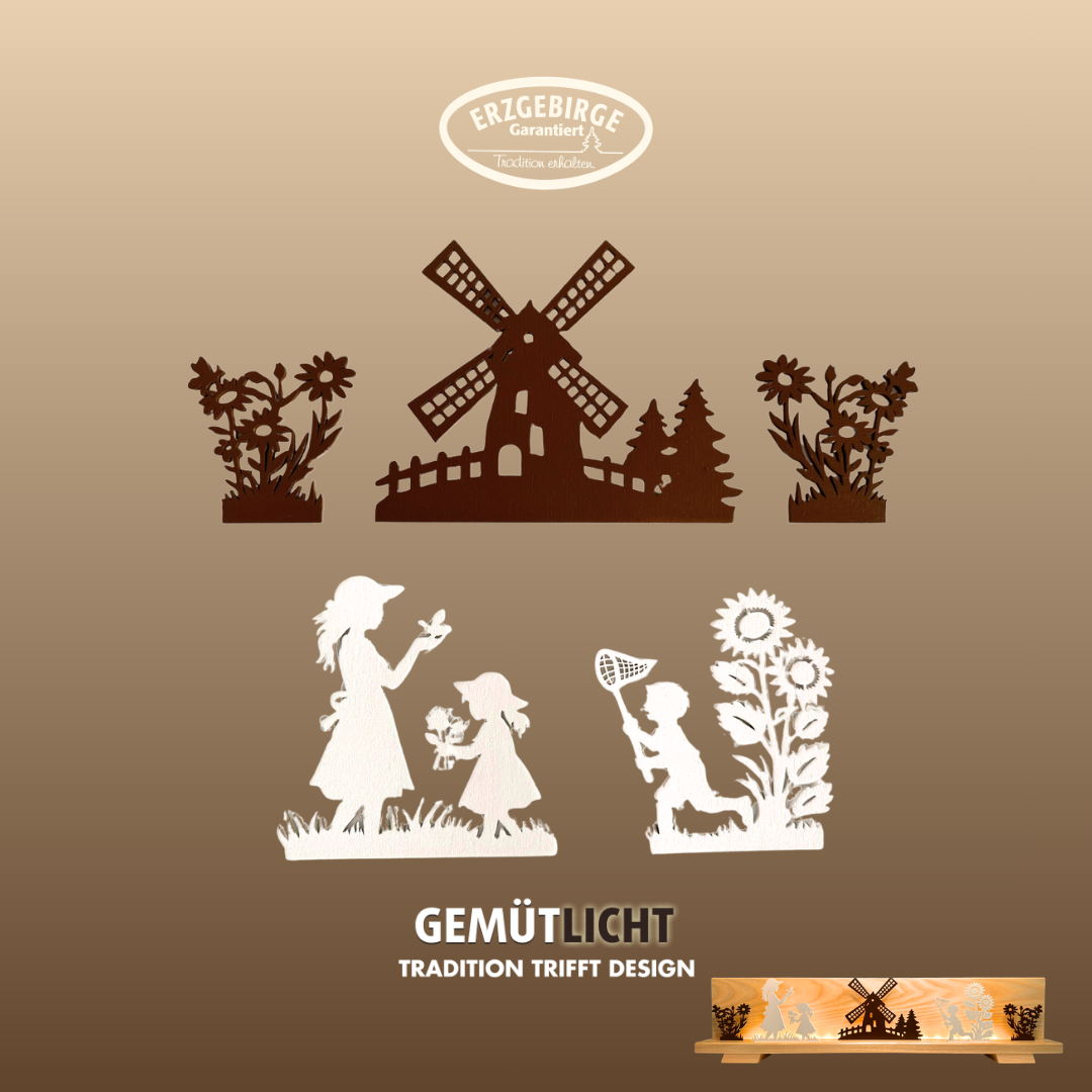 Das Figurenset „Sommeridylle“ bringt die warmen und unbeschwerten Momente des Sommers direkt in Ihr Zuhause. Die filigranen Motive zeigen liebevolle Szenen aus der Natur: spielende Kinder, blühende Sonnenblumen und eine idyllische Windmühle – alles im stilvollen Scherenschnitt-Design, das Tradition und modernes Wohnen harmonisch verbindet. Diese besondere Dekoration erinnert an sonnige Tage, Naturverbundenheit und die gemütliche Atmosphäre des Erzgebirges. Perfekt für alle, die erzgebirgische Handwerkskunst mit einem Hauch Sommer erleben möchten.