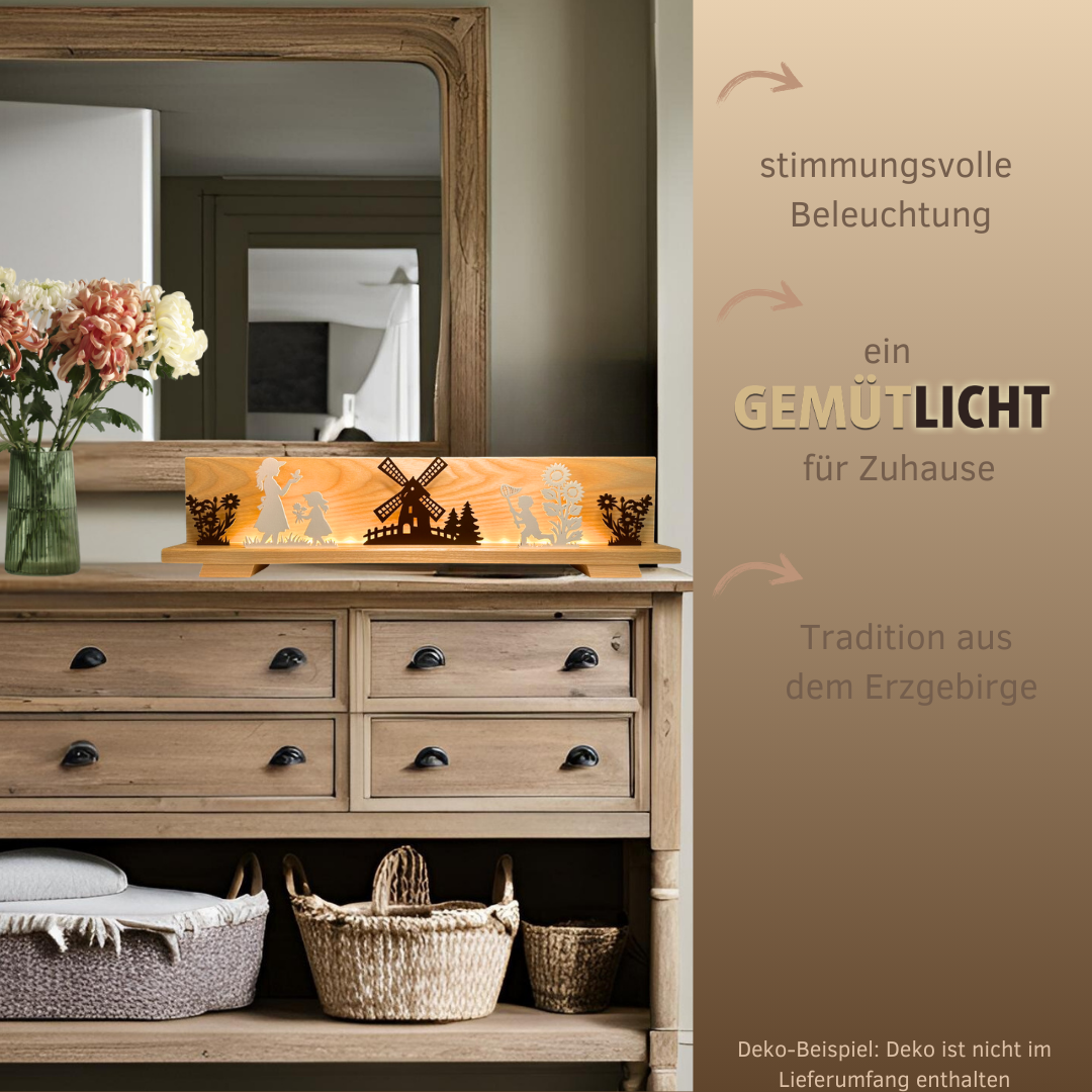 Mit seinem filigranen Design ist das Figurenset „Sommeridylle“ ein echter Blickfang – egal ob auf der Fensterbank, im Regal oder als Highlight auf dem Tisch.  In Kombination mit dem beleuchteten Sockel entfalten die Figuren eine faszinierende Wirkung und erzeugen wunderschöne Licht- und Schatteneffekte. Diese einzigartige Kombination aus erzgebirgischer Tradition, moderner Gestaltung und hochwertiger Verarbeitung macht das Set zu einem stilvollen Wohnaccessoire.