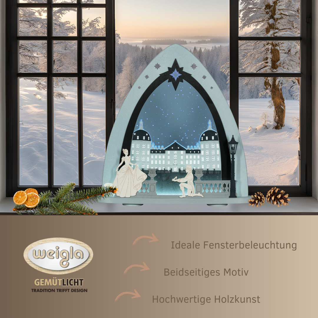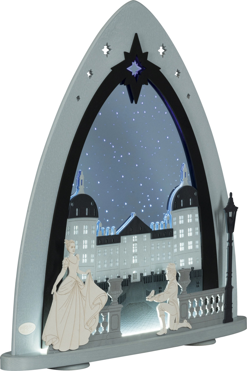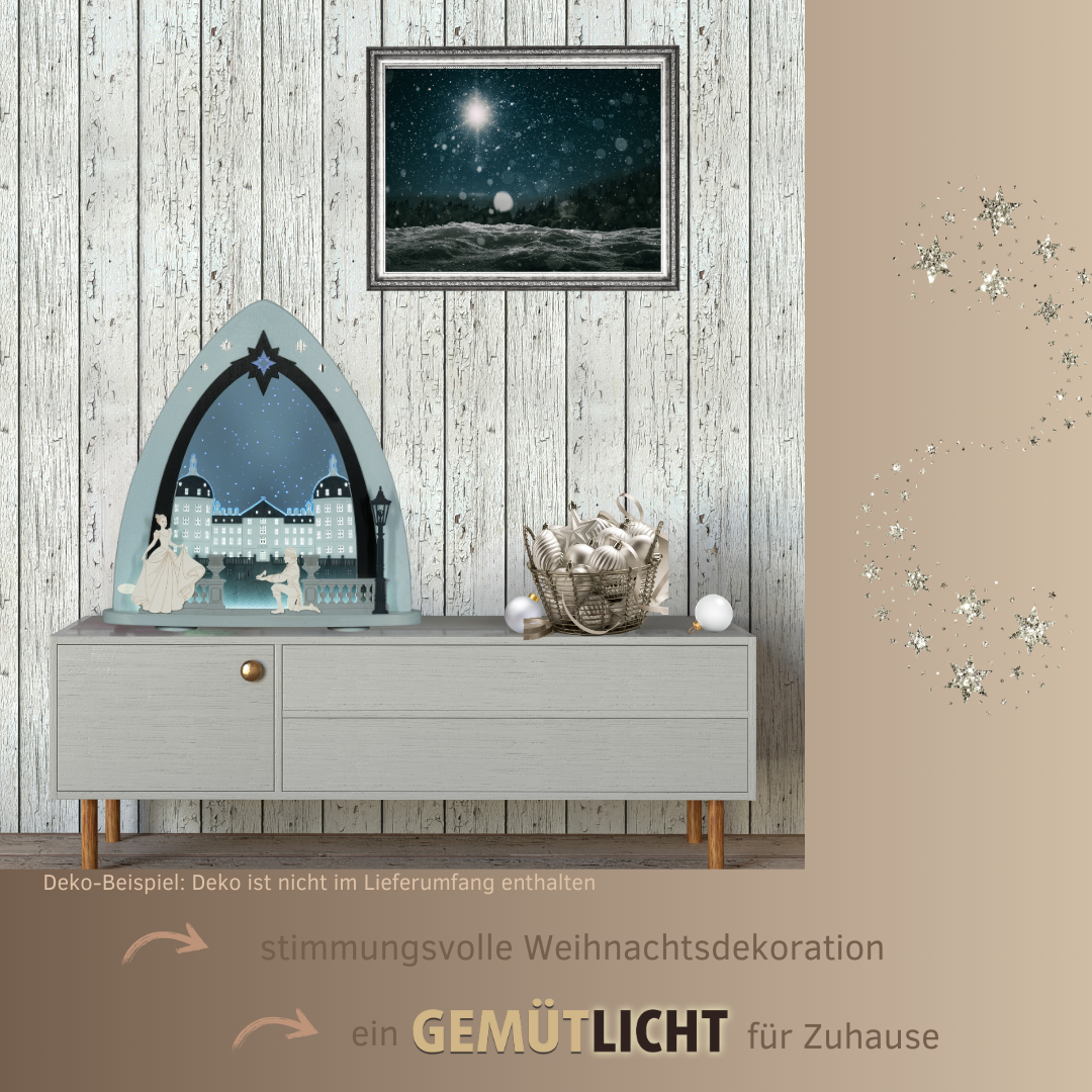 Das hochwertige, fluoreszierende Acrylglas in Blau und Weiß imitiert auf beeindruckende Weise das Licht, das aus den Fenstern des Schlosses zu dringen scheint. Die feinen Details des Schlosses werden durch modernste Lasertechnik präzise in das Acrylglas graviert, was einen faszinierenden 3D-Effekt erzeugt. Der in den Holzsockel integrierte LED-Strip sorgt für eine sanfte, indirekte Beleuchtung, die die Lichterspitze in ein warmes, weiches Licht taucht.