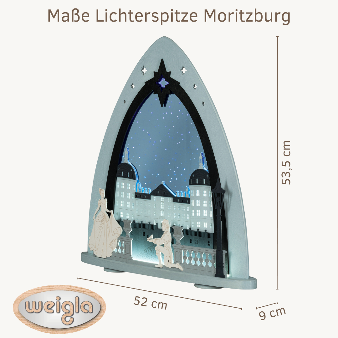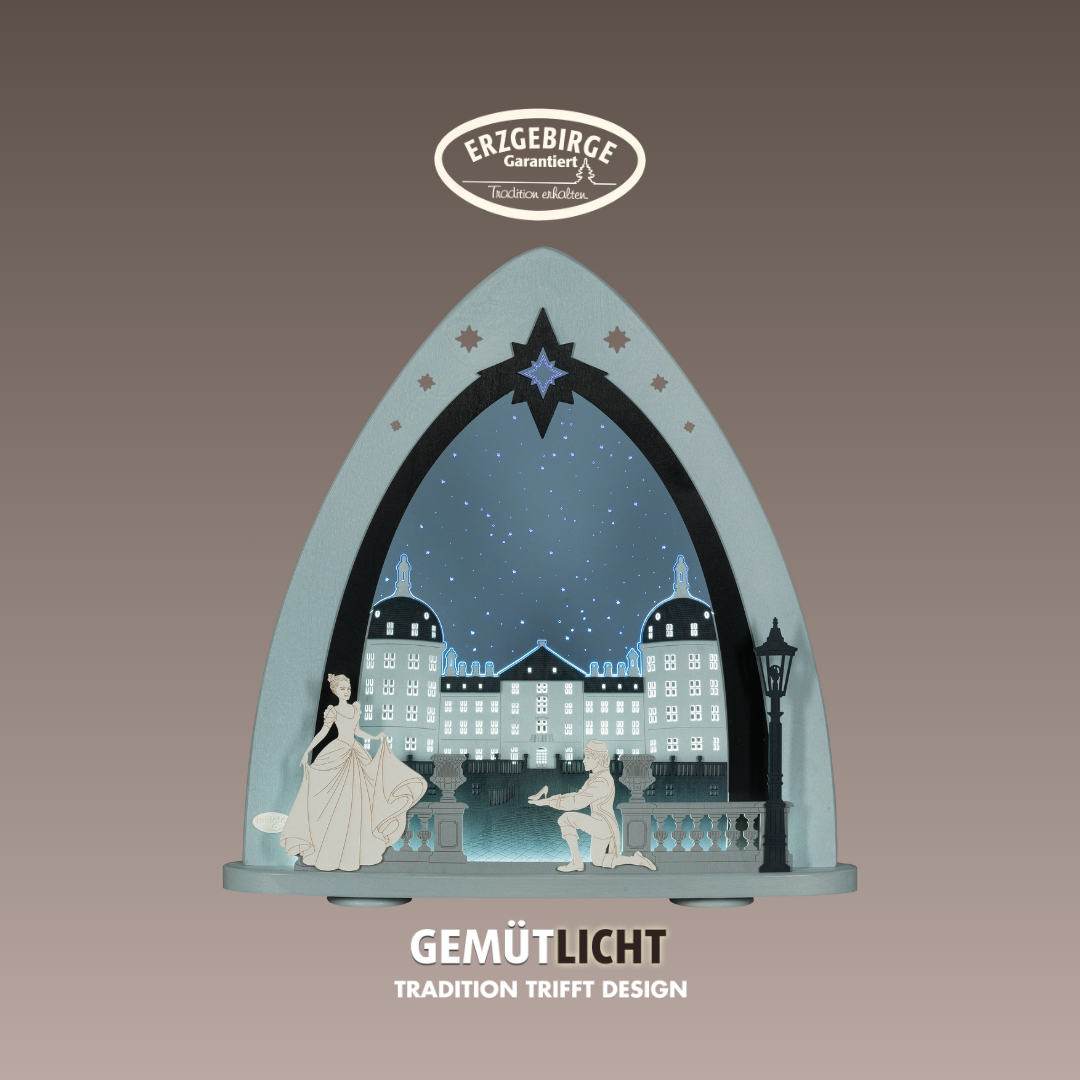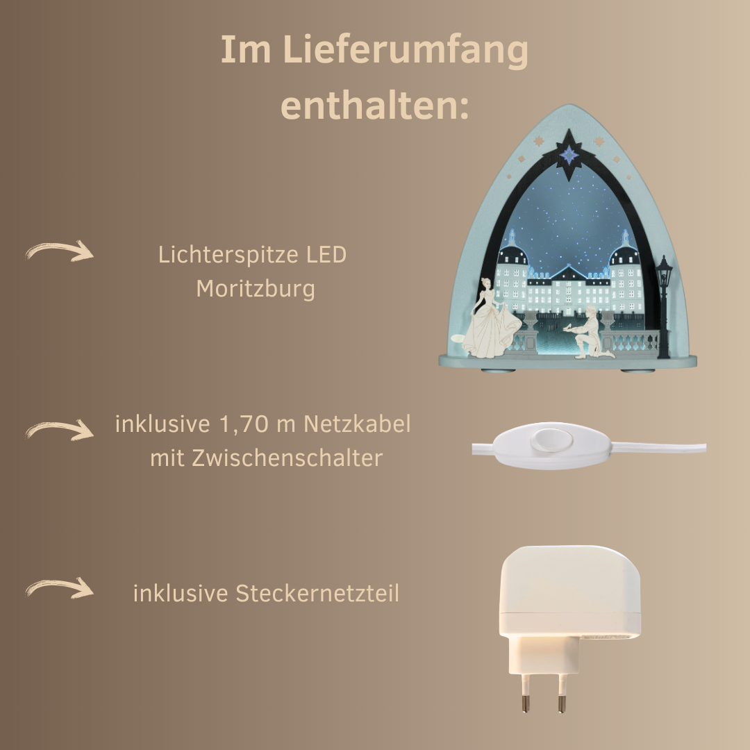 Entdecken Sie die Magie des Schlosses Moritzburg in Ihrem Zuhause! Unsere LED-Lichterspitze „Schloss Moritzburg“ ist eine Hommage an eines der schönsten Wasserschlösser Europas. Mit ihrem detailreichen Design und der innovativen LED-Beleuchtung zaubert sie eine bezaubernde Atmosphäre in jeden Raum.