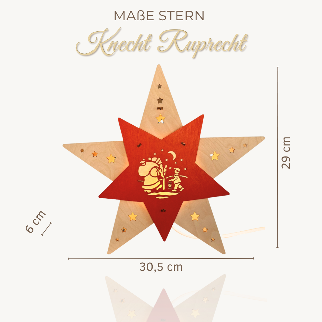 Das detailreiche Knecht Ruprecht Motiv steht im Mittelpunkt dieses einzigartigen Holzsterns und verleiht ihm eine nostalgische, erzgebirgische Note. Die fein gearbeiteten Ausschnitte lassen das LED-Licht eindrucksvoll durchscheinen und erzeugen eine lebendige Szenerie voller Charme. Da Vorder- und Rückseite identisch gestaltet sind, überzeugt der Stern aus jeder Perspektive – perfekt für frei stehende Dekorationen oder als Blickfang im Fenster.