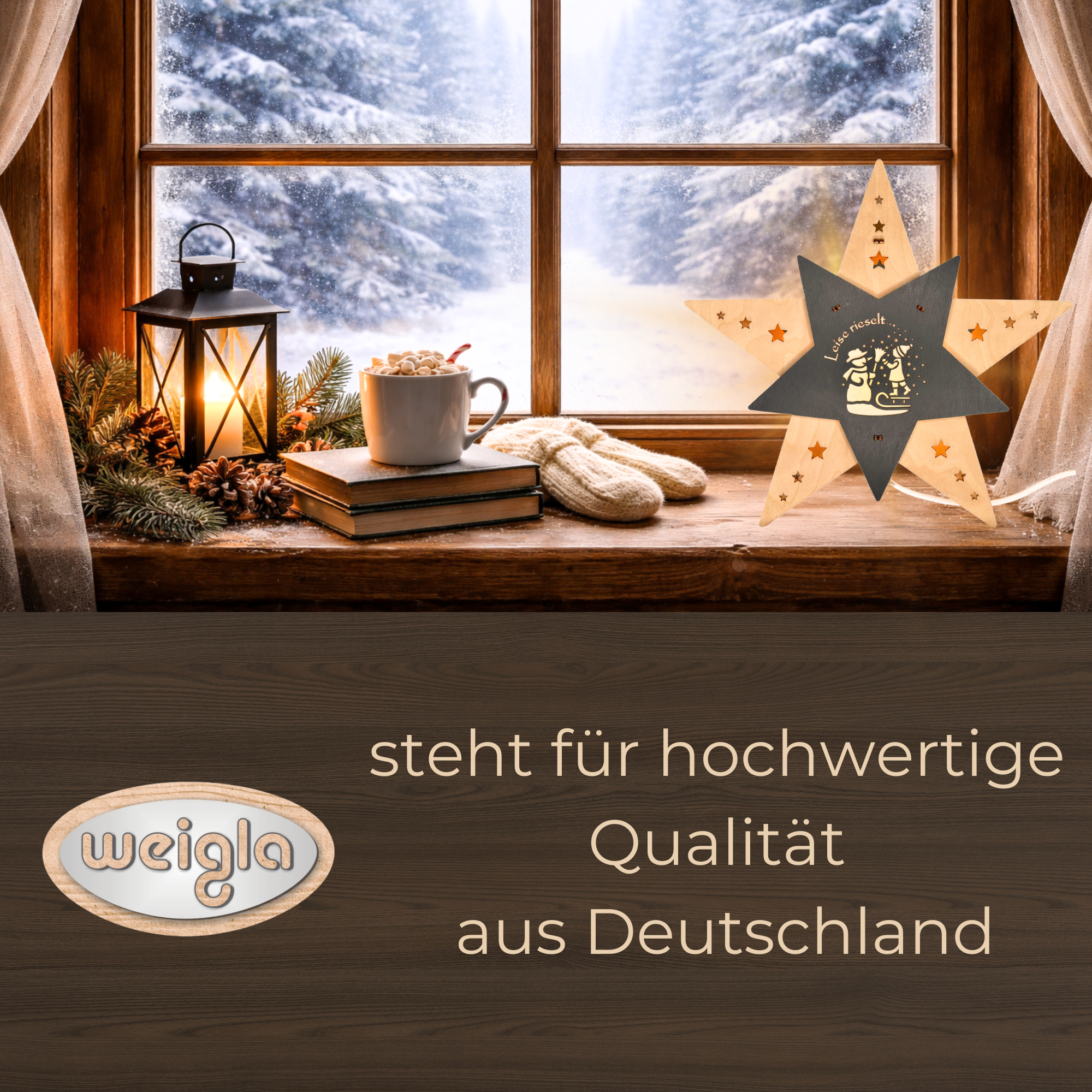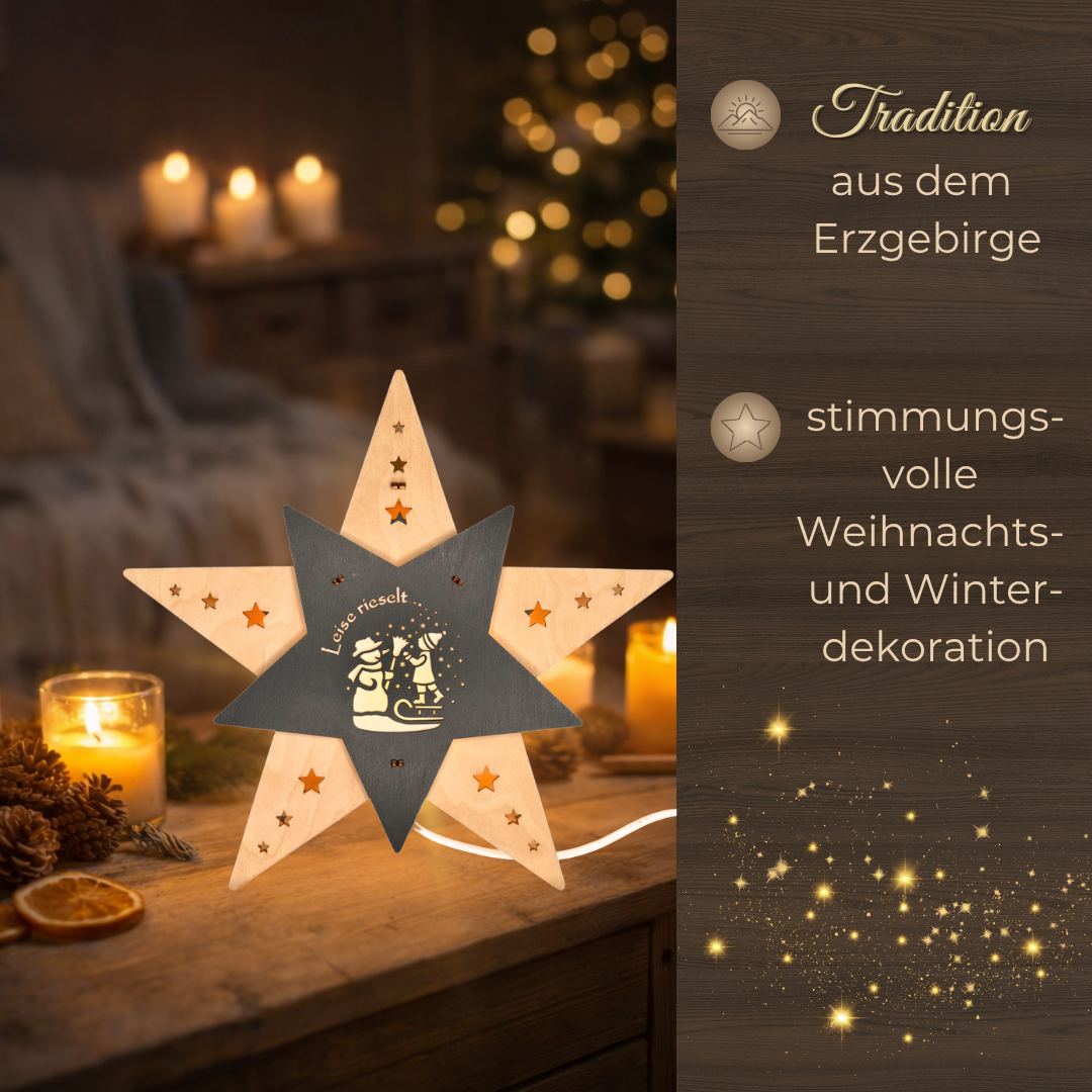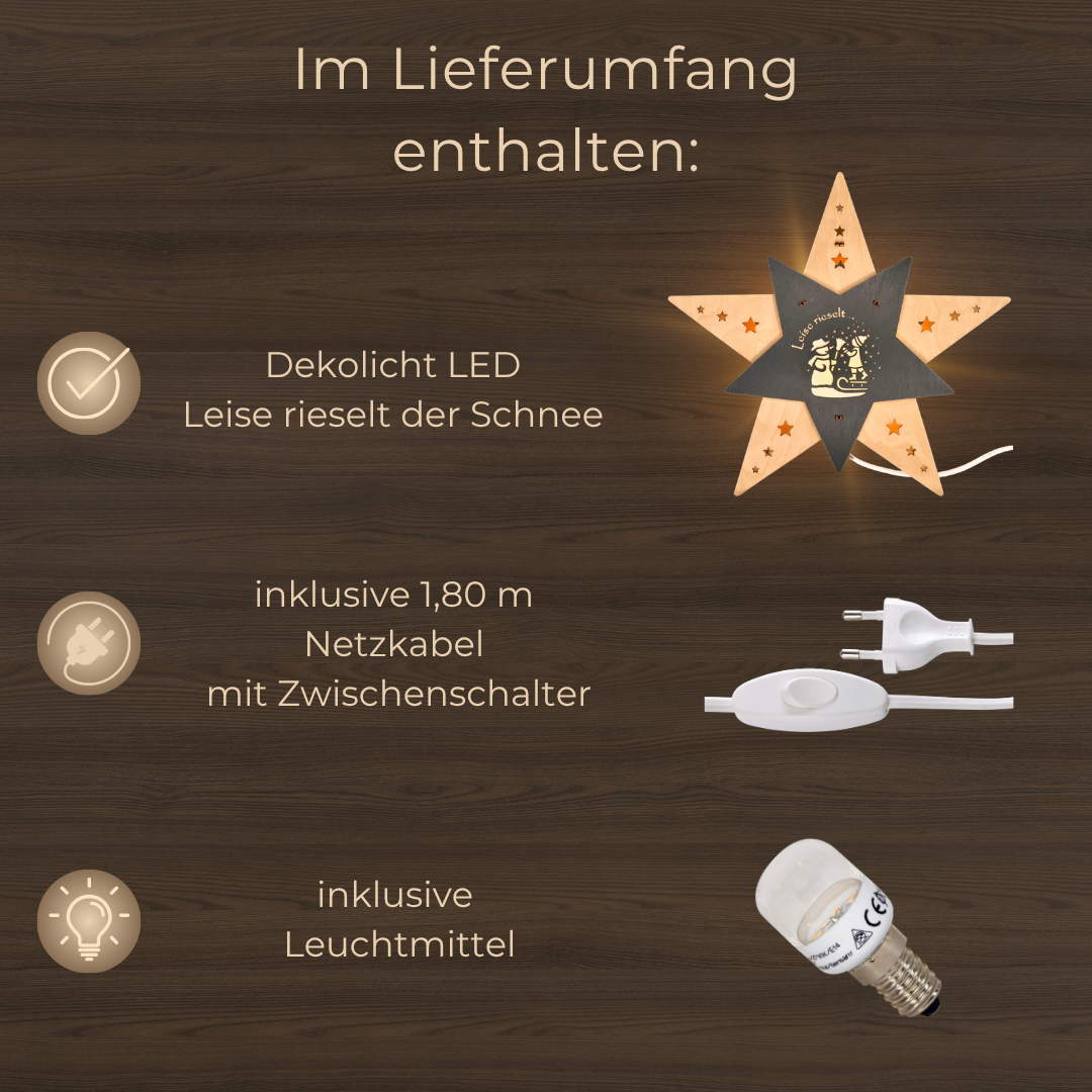 Im Mittelpunkt steht das fein gearbeitete Motiv „Leise rieselt der Schnee“, das durch filigrane Holzschnitte zum Leben erweckt wird. Die Szene erzählt eine winterliche Geschichte und wird durch die sanfte Beleuchtung besonders hervorgehoben. Dank der beidseitigen Gestaltung genießen Sie den zauberhaften Anblick aus jeder Perspektive – perfekt für Fenster, Regale oder frei stehende Dekorationen im Raum.