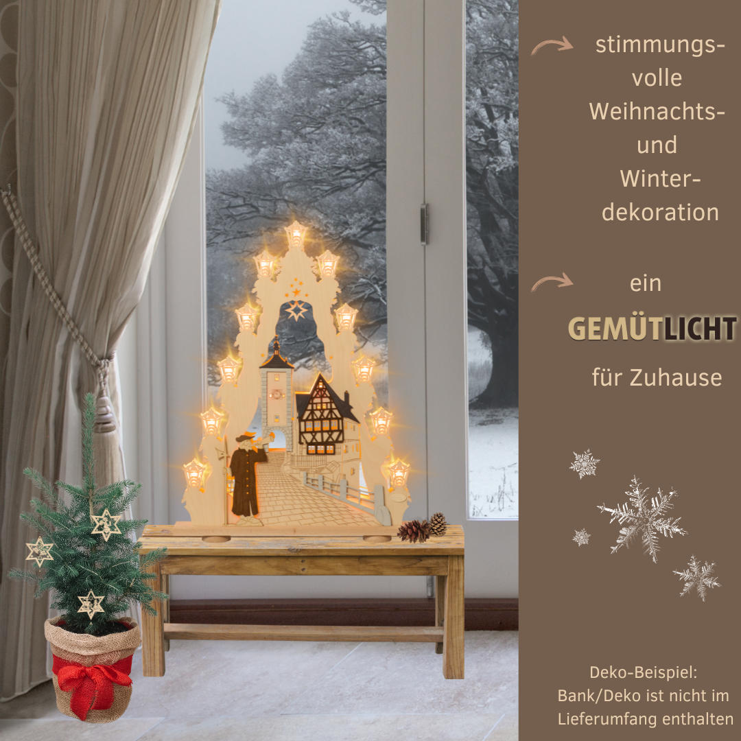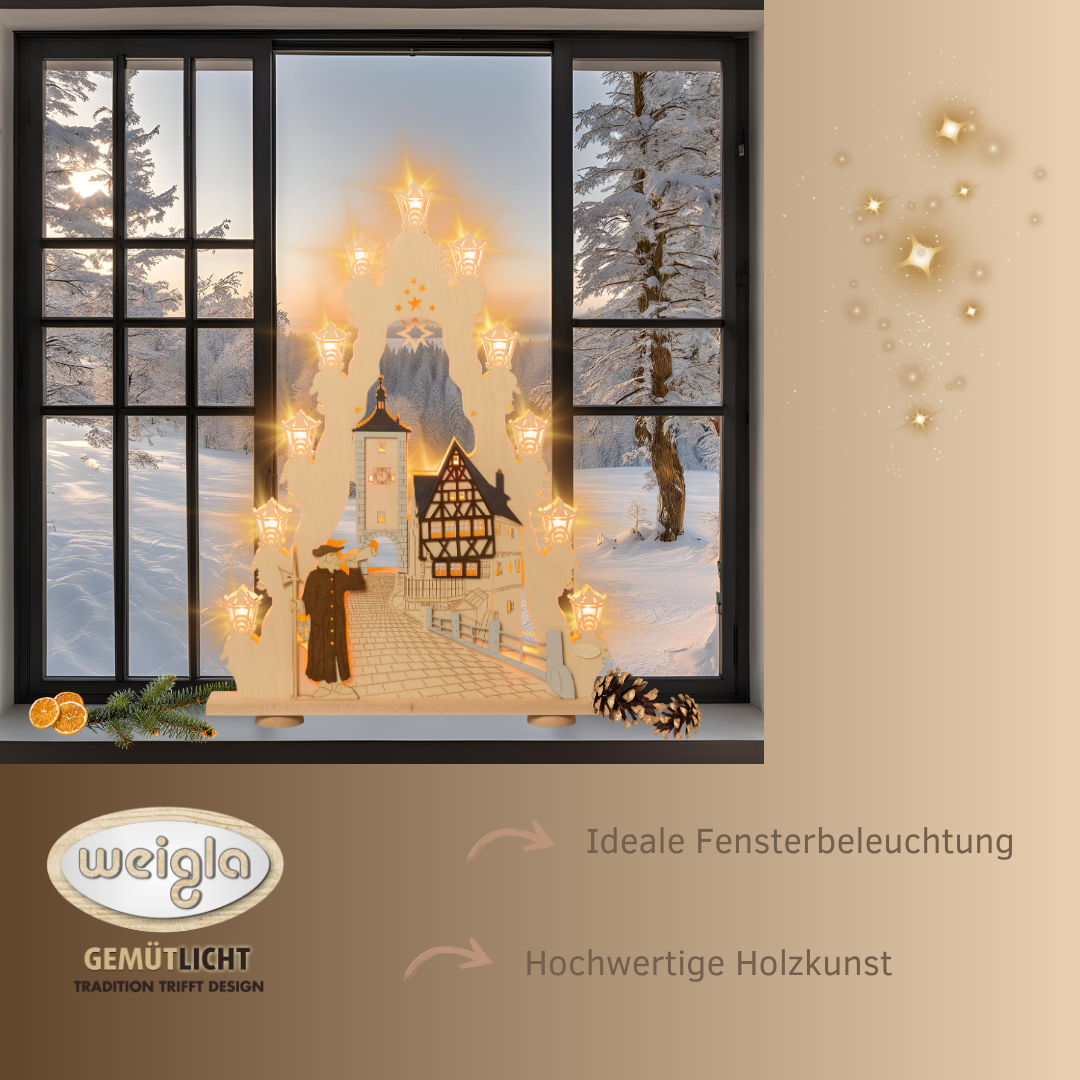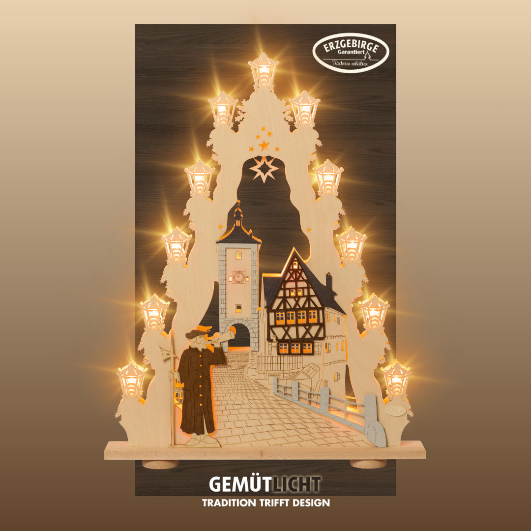 Holen Sie sich die Magie der berühmten mittelalterlichen Stadt Rothenburg ob der Tauber direkt in Ihr Wohnzimmer! Unsere kunstvoll gestaltete Lichterspitze fängt die einzigartige Atmosphäre dieser historischen Stadt ein, begleitet von einem charmanten Nachtwächter. Mit einem faszinierenden 3D-Effekt, der durch geschickt eingesetzte Farben entsteht, wird diese Lichterspitze zum Highlight jeder festlichen Dekoration. Die indirekte Beleuchtung taucht Ihre Räume in ein warmes und behagliches Licht – perfekt für die Wintermonate.