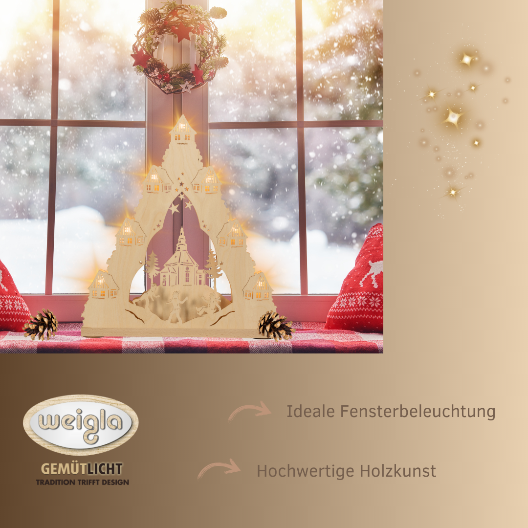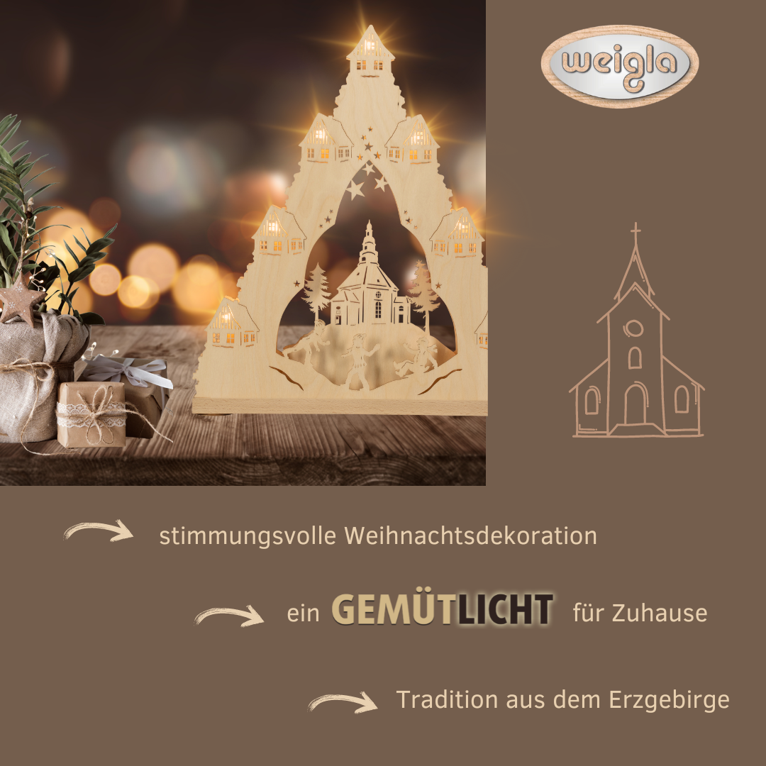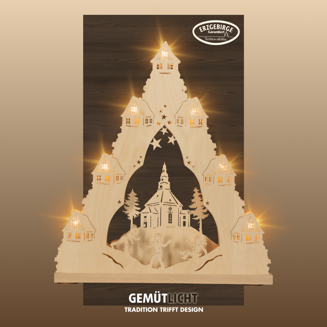 Die Seiffener Kirche, ein bekanntes Wahrzeichen des Erzgebirges, wird mit unserer exquisiten Lichterspitze in Ihrem Zuhause zum strahlenden Mittelpunkt Ihrer Weihnachtsdekoration. Diese meisterhaft gestaltete Dekoration fängt die feinen Details der berühmten Kirche ein und sorgt gleichzeitig für eine einladende Beleuchtung, die die winterliche Atmosphäre perfekt ergänzt. Ob als Blickfang auf der Fensterbank oder als Highlight im Wohnzimmer – die Lichterspitze „Seiffener Kirche“ verleiht jedem Raum einen festlichen Zauber, der die Herzen erwärmt.