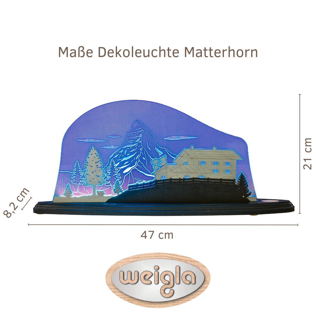 Die Motivleuchte besteht aus fluoreszierendem Acrylglas, das eine glänzend-glatte Oberfläche sowie eine hohe Transparenz besitzt. Durch die präzise Lasergravur entsteht ein intensiver, leuchtender Kanteneffekt, der die Konturen des Matterhorns besonders hervorhebt. Ergänzt wird das Design durch lasergraviertes Sperrholz, das mit seiner farblichen Gestaltung einen beeindruckenden 3D-Effekt erzielt.