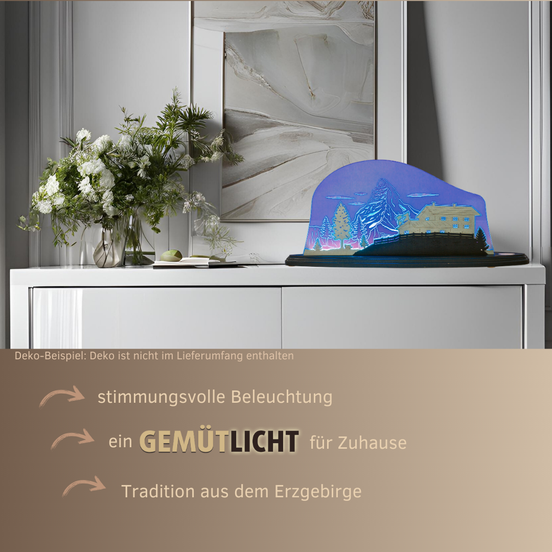 Der im farblich abgestimmten Massivholz-Sockel integrierte LED-Strip sorgt für eine gleichmäßige und energieeffiziente Beleuchtung. Das sanfte Licht taucht die Berglandschaft in ein traumhaftes Alpenambiente, das jeden Raum in eine beruhigende Wohlfühloase verwandelt.