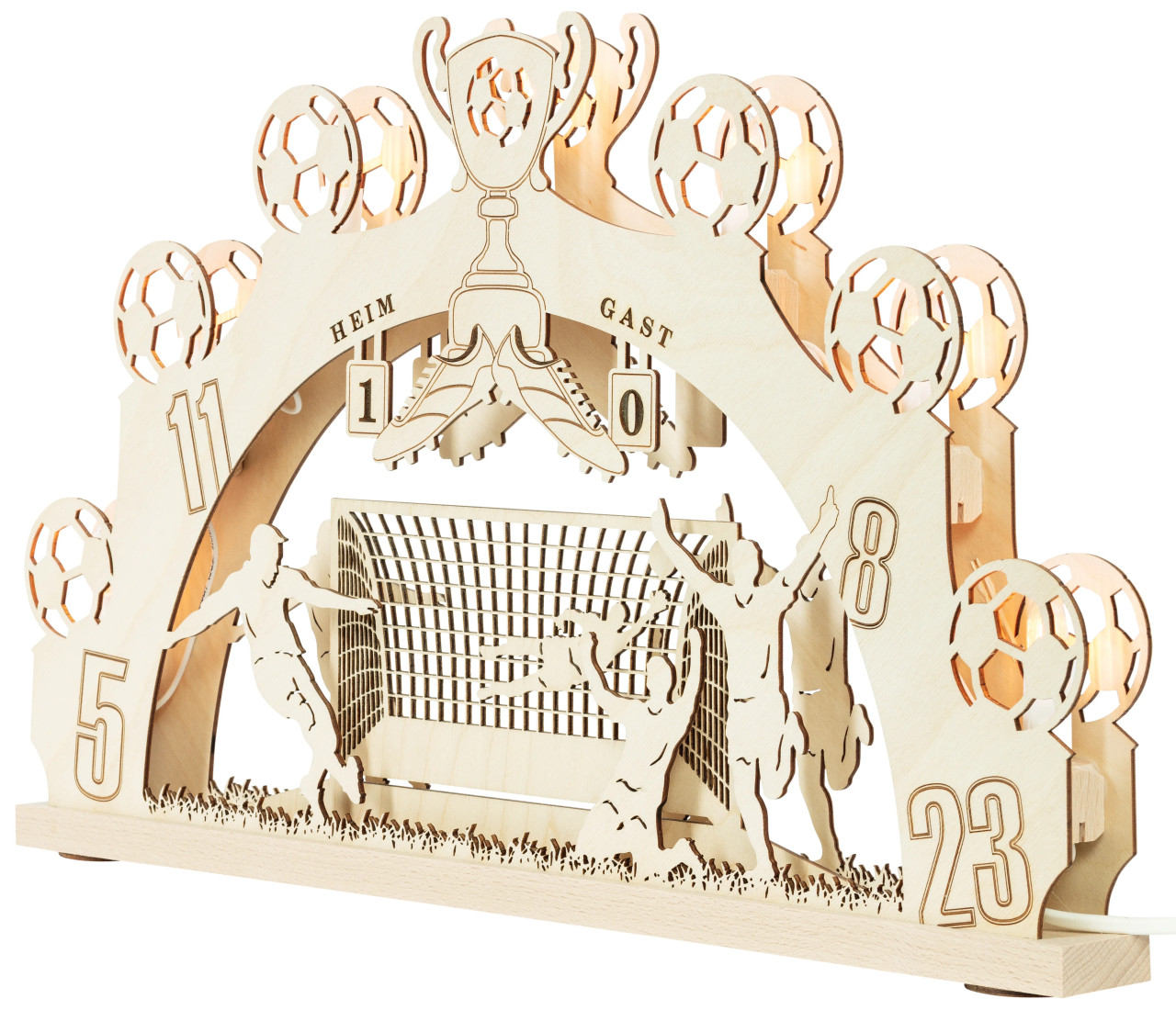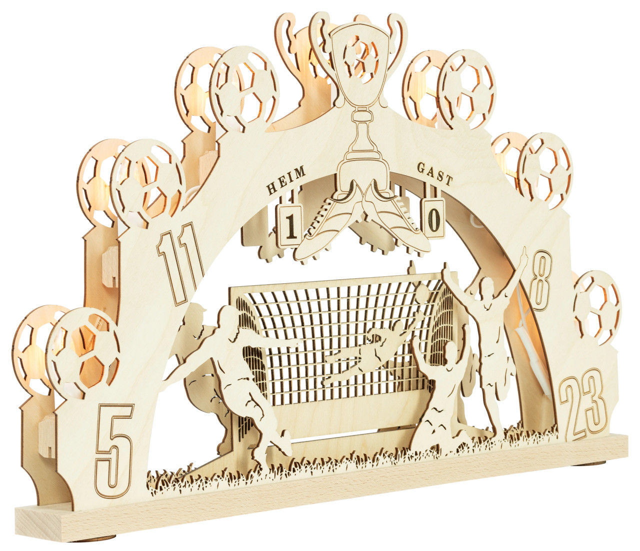 Gefertigt mit Liebe zum Detail aus hochwertigen Materialien, strahlt dieser Schwibbogen eine Qualität aus, die Sie sofort spüren werden. Die sieben Flammen erzeugen ein warmes, einladendes Licht, das Sie in die Welt des Fußballs entführt. Stellen Sie ihn in Ihr Wohnzimmer, den Hobbyraum oder an jeden Ort, an dem Sie die Fußballatmosphäre genießen möchten.