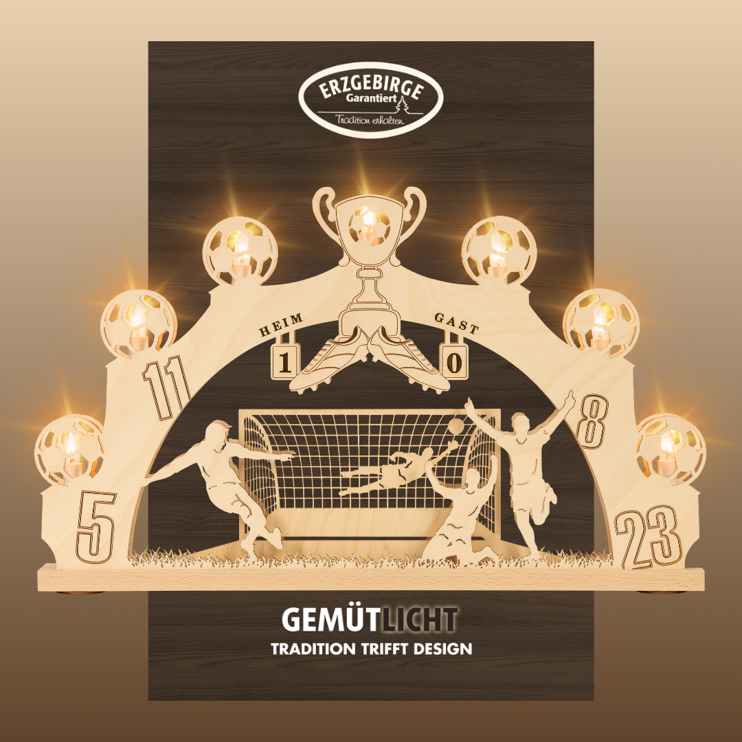 Ein Tor für wahre Fußballfans! Unser 7-flammiger Schwibbogen ‚Fußball‘ verwandelt Ihr Zuhause in eine kleine Fußball-Arena. Mit seinem einzigartigen Design, das die Leidenschaft für den schönsten Sport der Welt widerspiegelt, ist dieser Schwibbogen mehr als nur eine Dekoration – er ist ein Statement für alle Fußballbegeisterten.