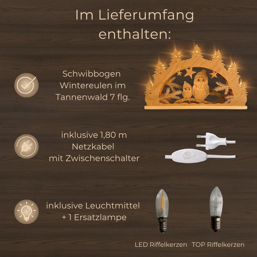 Jeder Schwibbogen wird mit höchster Präzision gefertigt und überzeugt durch feinste Holzarbeiten. Die niedlichen Wintereulen mit ihren kleinen Mützen sitzen idyllisch im Tannenwald und erzählen eine winterliche Geschichte voller Ruhe und Naturverbundenheit. Das hochwertige Holz sowie die sorgfältige Verarbeitung garantieren Langlebigkeit und machen jedes Stück zu einem Hingucker – Erzgebirge garantiert.