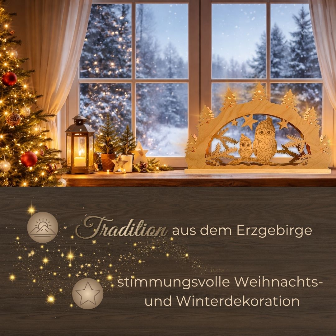 Der Schwibbogen „Wintereulen im Tannenwald“ bringt die zauberhafte Stimmung verschneiter Winterabende direkt in Ihr Zuhause. Mit seinen warm leuchtenden Lichtern und der liebevoll gestalteten Szene aus Eulen und Tannen entsteht eine behagliche Atmosphäre, die Herz und Seele berührt. Perfekt für die Adventszeit oder als ganzjähriger Blickfang – dieser Lichterbogen steht für echte Erzgebirgstradition und sorgt für unvergleichliche Gemütlichkeit.