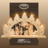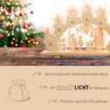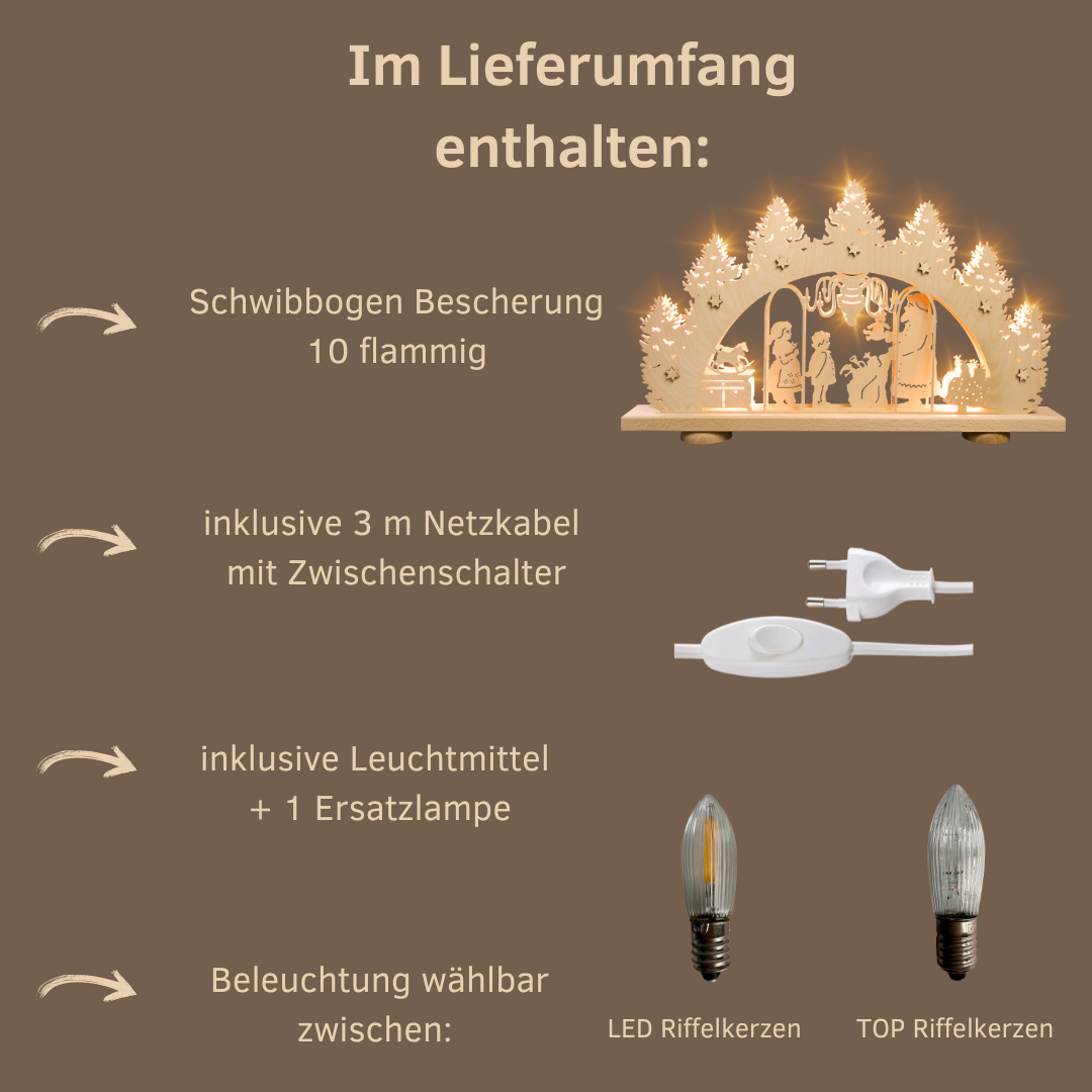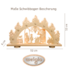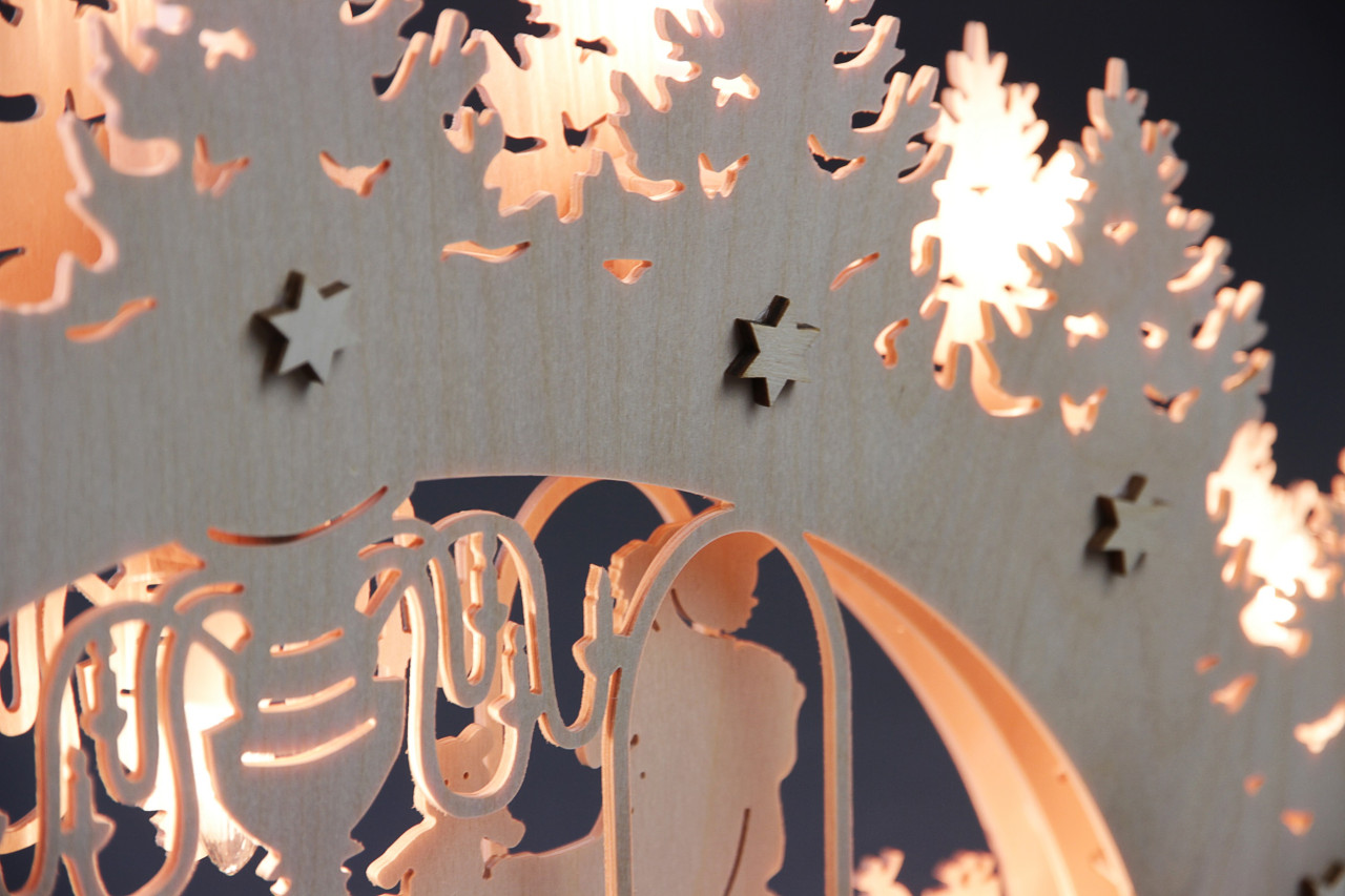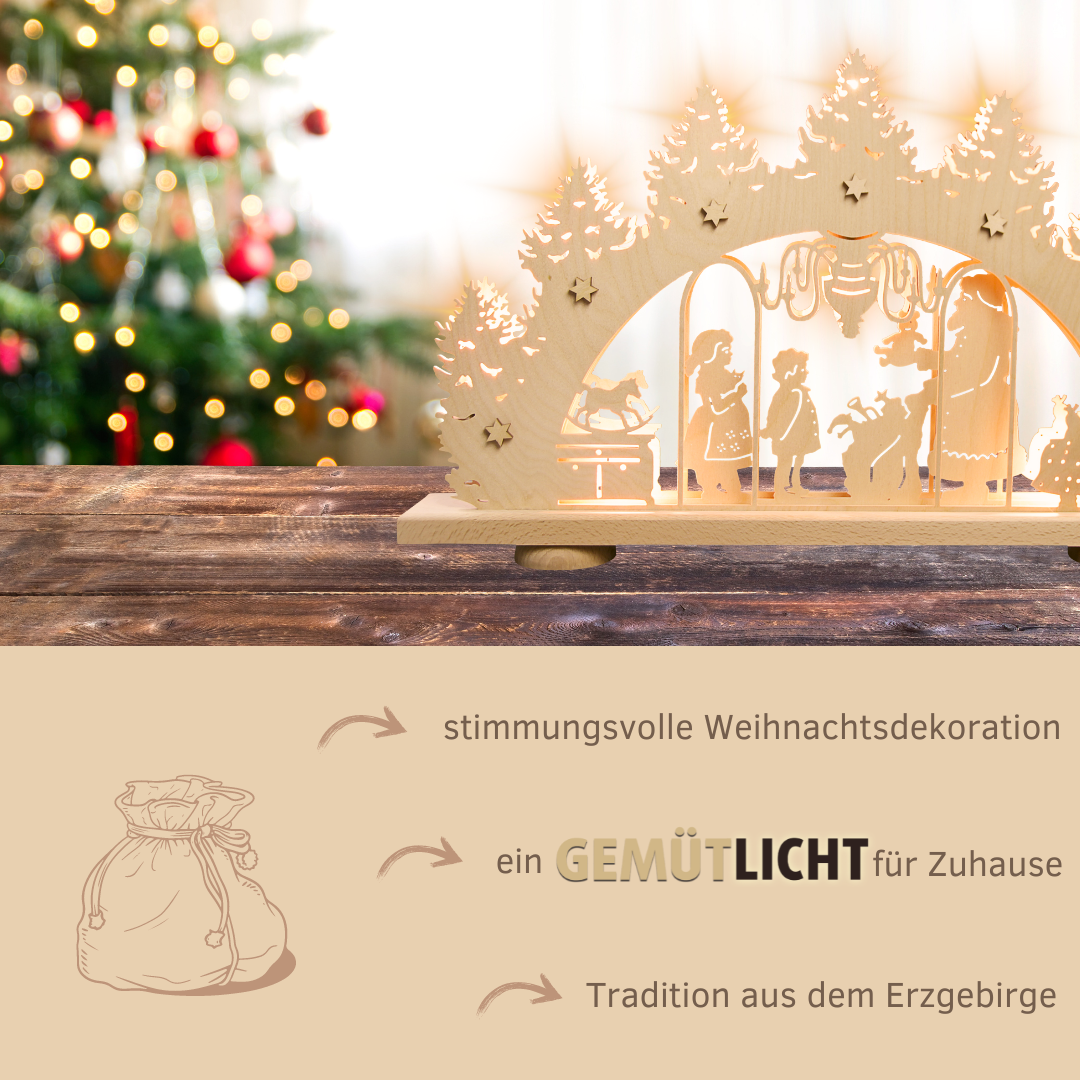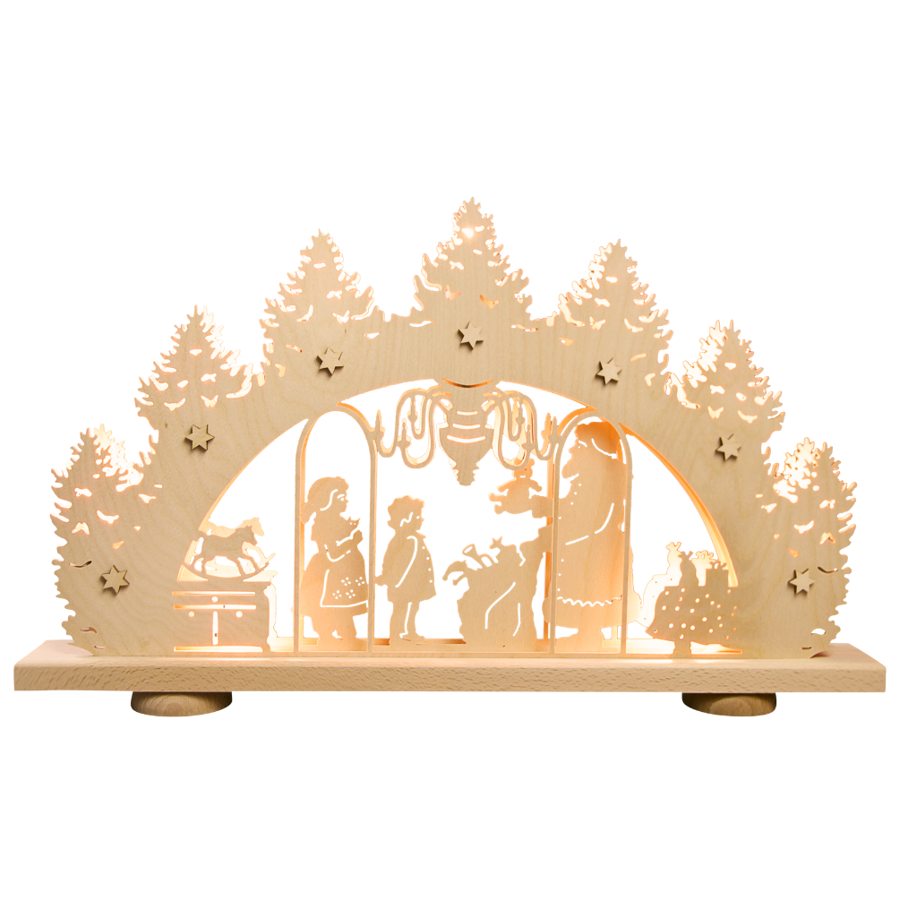 Der Schwibbogen „Bescherung“ ist ein sehr beliebtes Motiv in der schönen Weihnachtszeit. Am Fenster ist er mit seinen kleinen Bäumchen, in welchen die Kerzen versteckt sind, ein echter Blickfang. Eine Besonderheit bei diesem Schwibbogen sind die kleinen Sterne, welche extra auf den Blenden aufgebracht wurden. Der Lichterbogen wird nicht nur in seinem Außenbogen beleuchtet, sondern auch im Inneren (Innenbeleuchtung). Der Schwibbogen wird aus Birkensperrholz gefertigt.