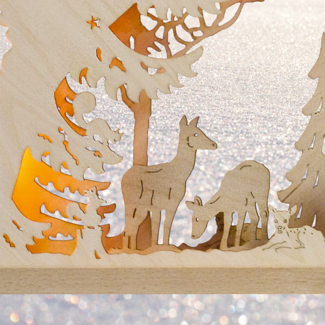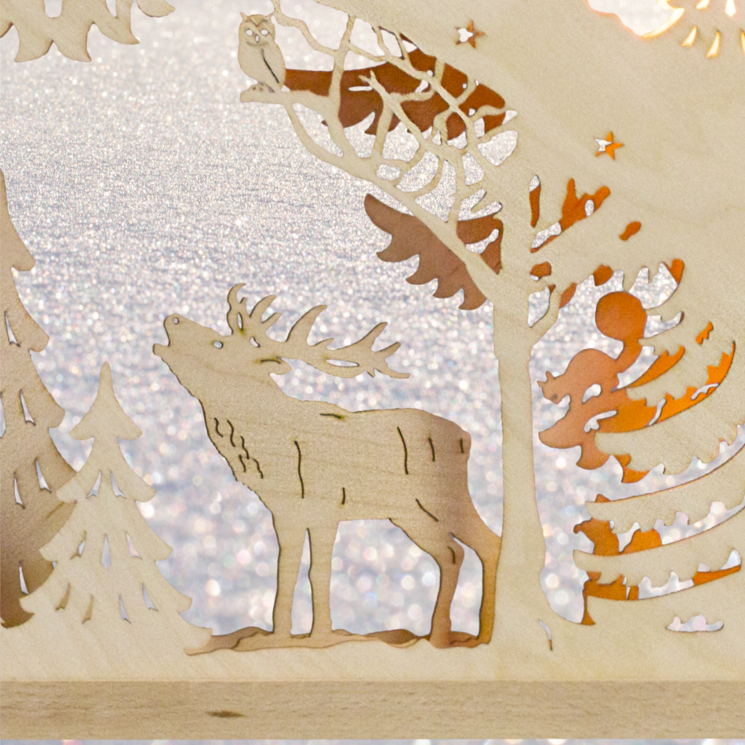 Das zauberhafte Motiv einer friedlichen Hirschfamilie inmitten eines verschneiten Waldes sorgt für eine wohltuende und gemütliche Atmosphäre, die perfekt zur besinnlichen Jahreszeit passt. Mit seinen detailreichen Bäumchen, hinter denen sich kunstvoll versteckte Kerzen verbergen, wird dieser Schwibbogen am Fenster oder auf der Kommode zu einem wahren Hingucker. Genießen Sie das warme Kerzenlicht, das durch die feinen Ausschnitte im Birkenholz strahlt und Ihre Räume in weihnachtlichen Glanz hüllt.