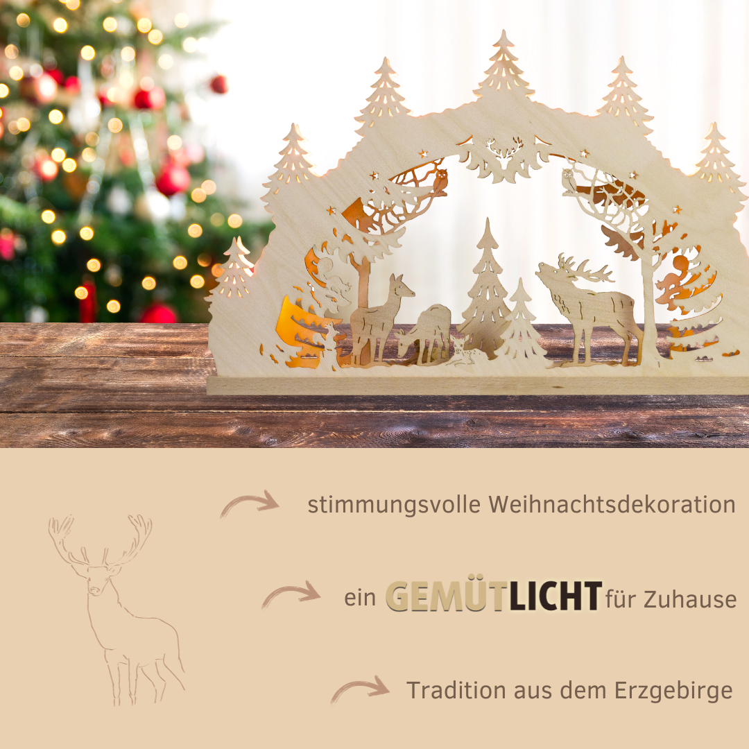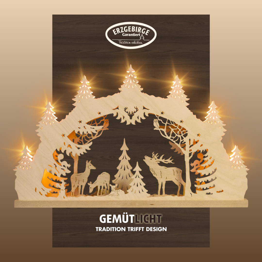 Ein Traum aus Holz Neben zahlreichen Waldtieren erfreut einen der Schwibbogen Hirschfamilie durch ein warmes Licht und eine super Qualität. In der Verarbeitung steckt viel Liebe zum Detail und das Holz verleiht dem Produkt einen weihnachtlichen Zauber. Auch die Lieferung ging schnell und unkompliziert.