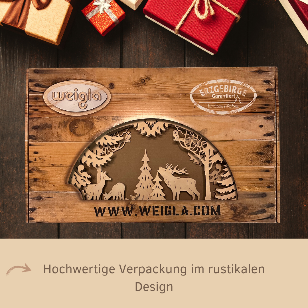 Die Kerzen des Schwibbogens „Hirschfamilie“ sind geschickt hinter den kleinen Bäumen platziert und sorgen für ein stimmungsvolles, indirektes Licht. Egal, ob Sie den Schwibbogen auf der Fensterbank, im Eingangsbereich oder auf einem Beistelltisch platzieren – er schafft eine festliche, warme Atmosphäre, die Ihre Weihnachtsdekoration vervollständigt. Das sanfte Licht der Kerzen lädt zu gemütlichen Abenden ein und verbreitet eine wohlige Ruhe, die Sie den Trubel des Alltags vergessen lässt.