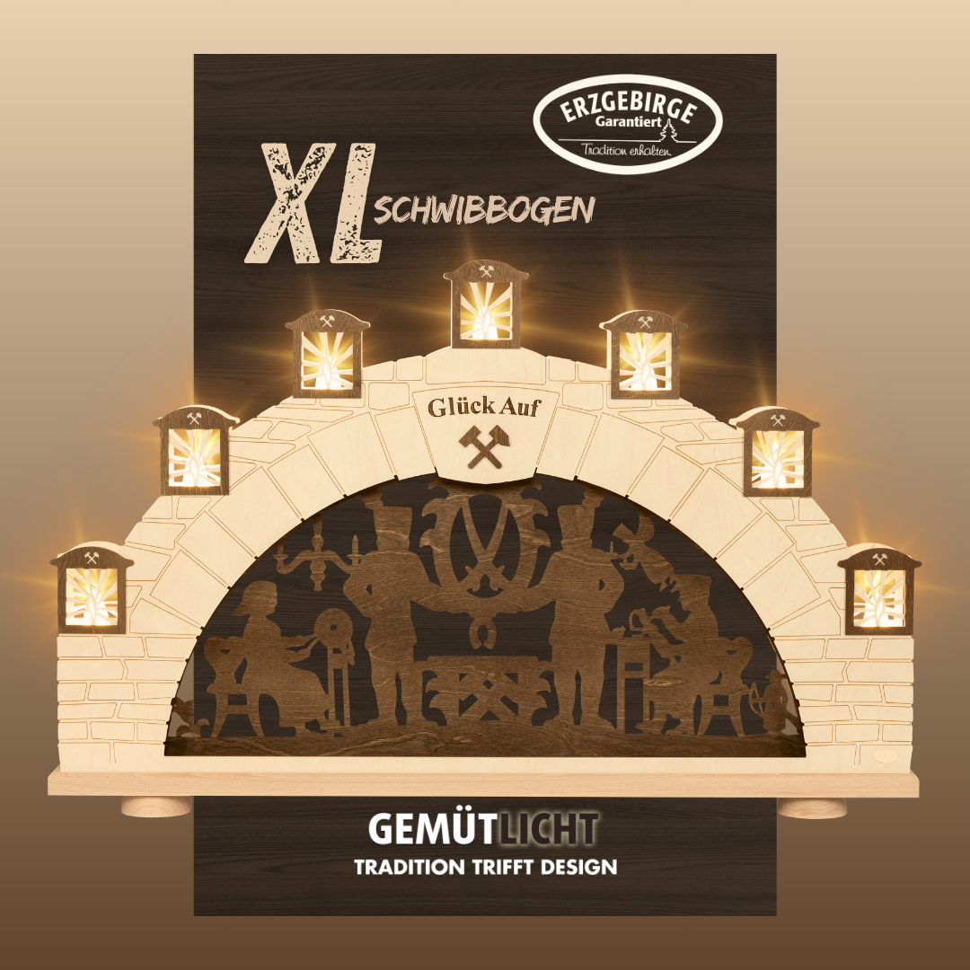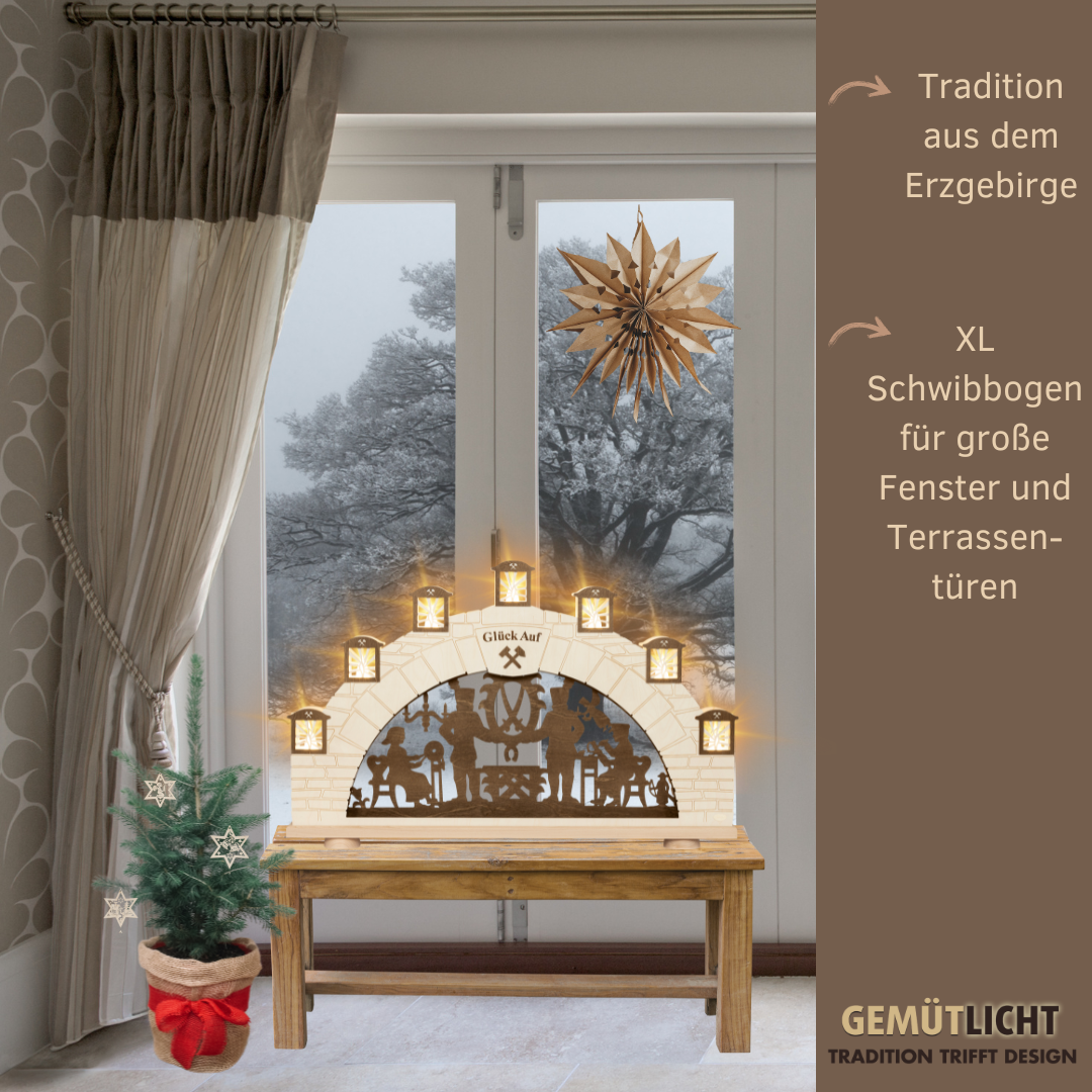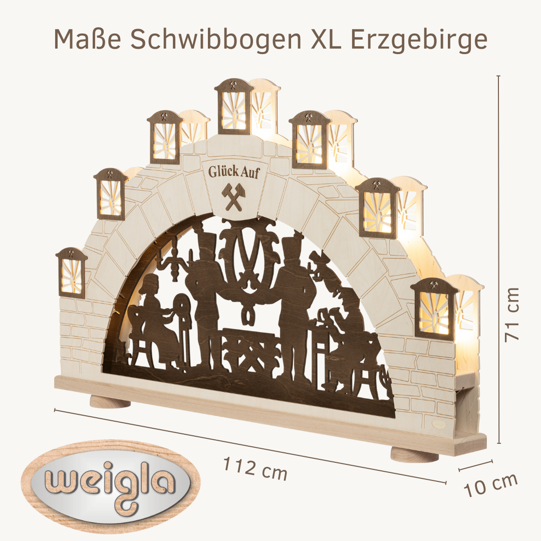 Unser XL Schwibbogen Erzgebirge ist ein echter Hingucker für Ihr Zuhause! Wir schauen in das Mundloch eines Stollens! Das typische Bergmannsmotiv ist darin ersichtlich, welches in brauner Farbe abgesetzt ist. Die LED Lämpchen sind hinter den Grubenlichtern versteckt. Tauchen Sie Ihr Heim in ein weihnachtliches Ambiente mit unserem XL Schwibbogen!