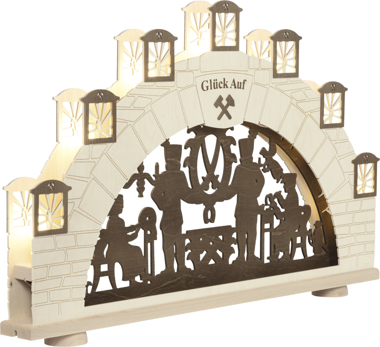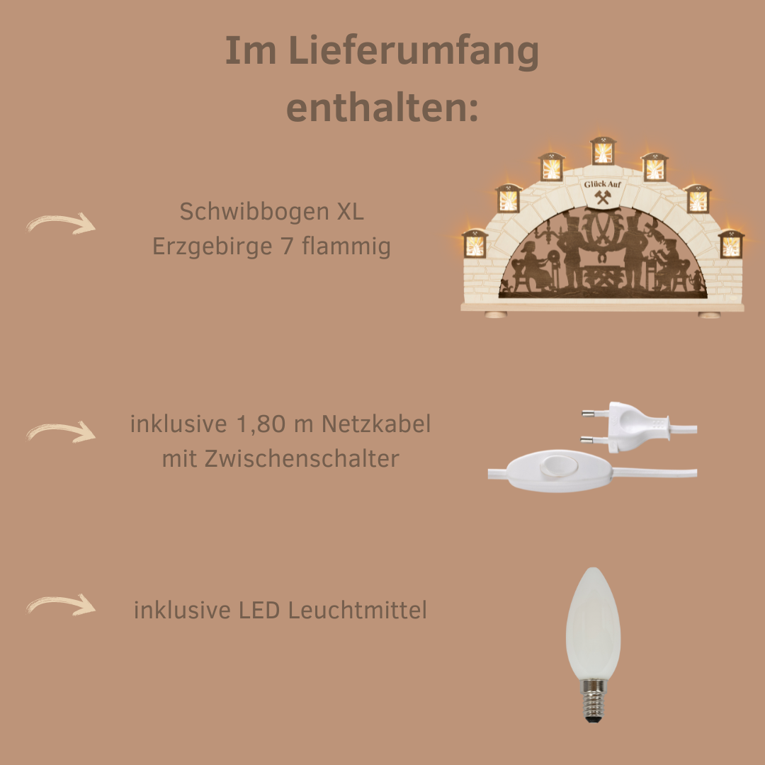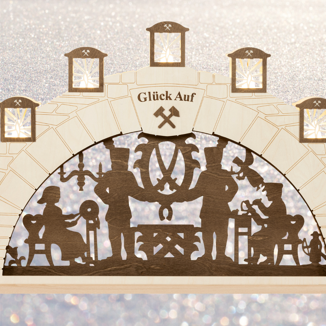 Unser XL Schwibbogen Erzgebirge ist ein echter Hingucker für Ihr Zuhause! Wir schauen in das Mundloch eines Stollens! Das typische Bergmannsmotiv ist darin ersichtlich, welches in brauner Farbe abgesetzt ist. Die LED Lämpchen sind hinter den Grubenlichtern versteckt. Tauchen Sie Ihr Heim in ein weihnachtliches Ambiente mit unserem XL Schwibbogen!