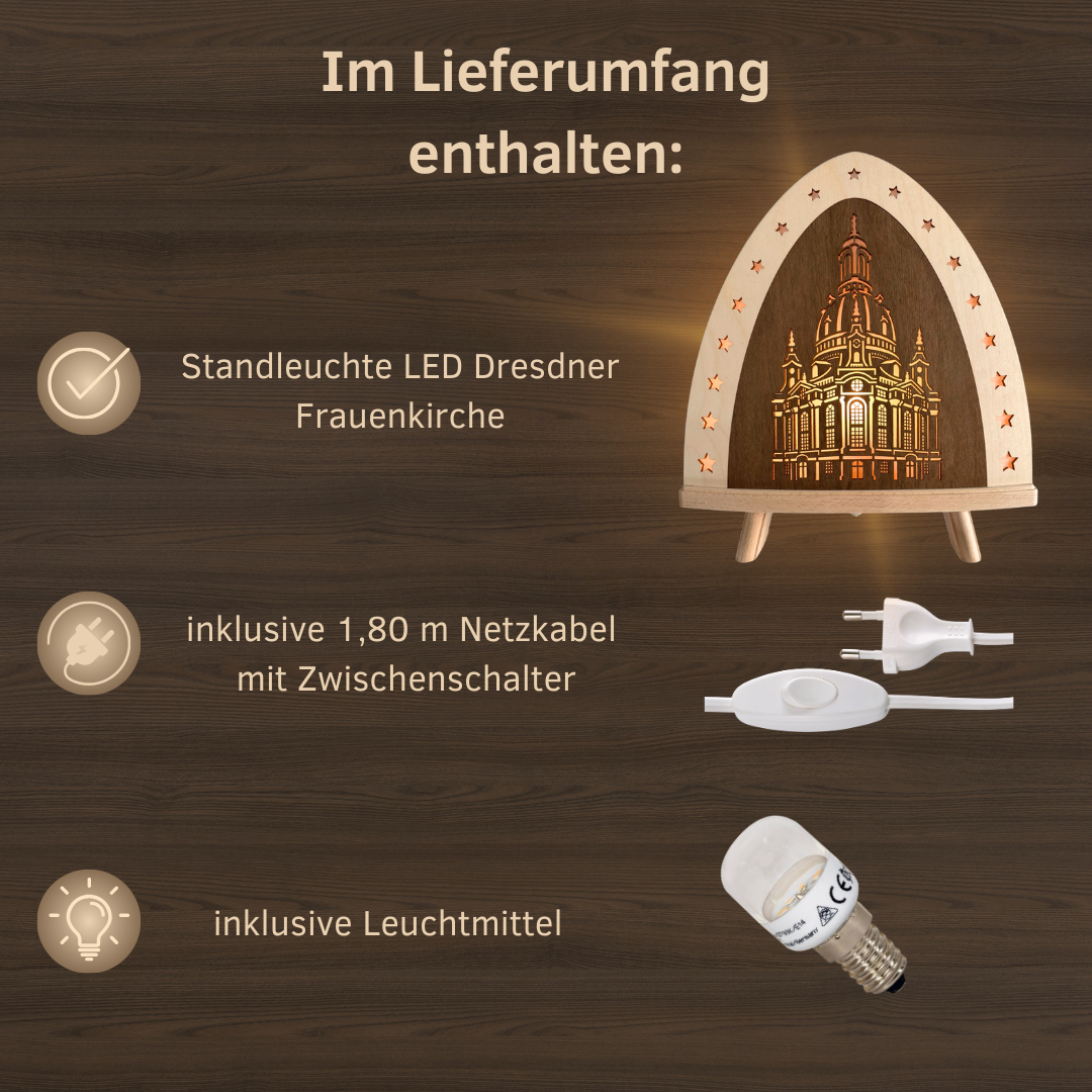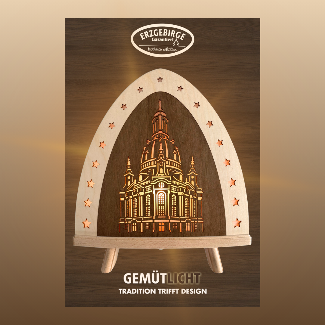 Die Dekoleuchte Dresdner Frauenkirche verbindet zeitlose Handwerkskunst mit moderner Wohnästhetik. Inspiriert von der weltberühmten Dresdner Frauenkirche entsteht ein einzigartiges Holz-Lichtobjekt, das jedes Zuhause in eine warme, gemütliche Atmosphäre taucht. Die filigran gelaserte Silhouette der Kirche wird von sanftem Licht durchstrahlt und erzeugt ein faszinierendes Spiel aus Schatten und Konturen. Diese dekorative Holzleuchte für Wohnraum, Schlafzimmer oder Fensterbank ist mehr als nur Beleuchtung – sie ist ein Stück deutscher Kultur und Tradition.